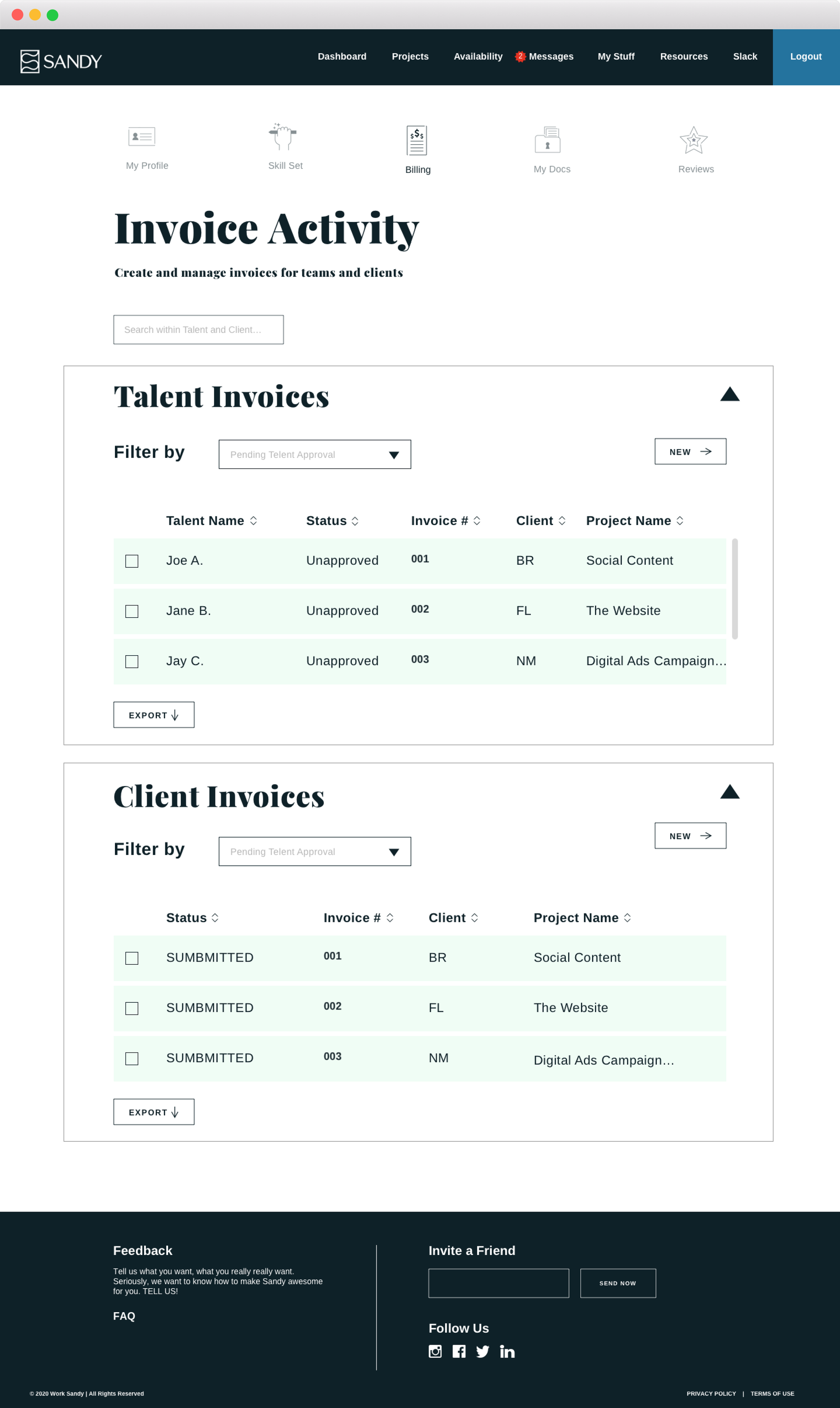 Anastasia Salazar Studio to assist with the styling of the user interface for Sandy. Sandy is designed to help brands and agencies find, manage, and pay elastic teams of diverse expert freelancers all in one place.